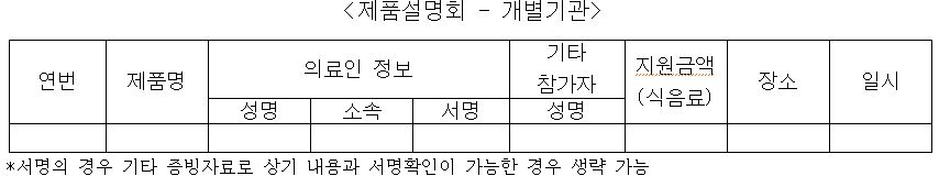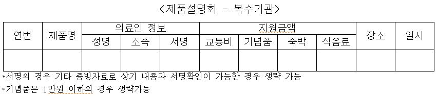 제품설명회의 경우 의료계의 관심이 높은 항목이었다. 특히 복수기관을 대상으로 한 제품설명회는 복지부도 "제도시행시 가장 우려되는 항목"이라고 밝히며, 교통비나 숙박 등의 경우 갈음할 수 있는 자료가 있을 것으로 보기에 참석 의료인별로 보고서를 작성하는 방향으로 결정했다고 이해를 구했다.