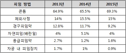 우리나라 청소년들이 가장 많이 사용하는 피임법은 콘돔으로, 2015년 조사에서 69.3%가 사용하고 있다고 응답해 2013년에 비해서 4.4% 상승했다.