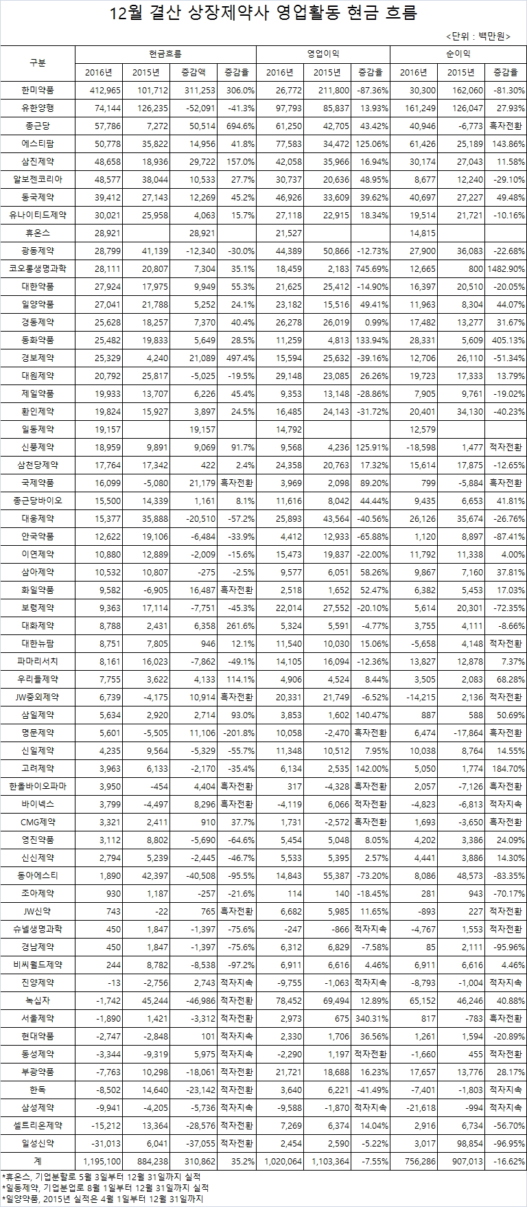 아들중 삼성제약, 동성제약, 현대약품, 진양제약 등 4개사는 2015년에 이어 지난해도 현금유출액이 유입액보다 많았다.