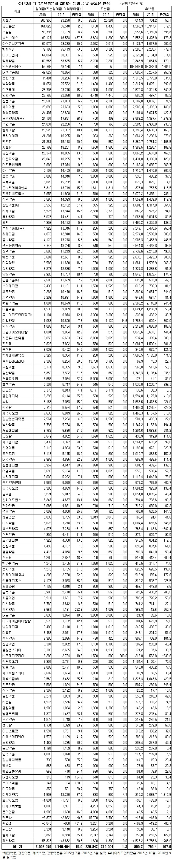 이들 업체의 2016년 말 자본금은 2,209억원으로 2015말 보다 1.3% 증가했다. 업체별로는 복산나이스가 36억원으로 200.3% 늘었고, 비즈메디코리아가 200.0% 늘어난 15억원, 아세아약품이 14.7% 증가한 6억원이었다. 대일양행은 44.6% 줄어든 6억원, 동보약품은 10.0% 줄어든 4억원이었다.