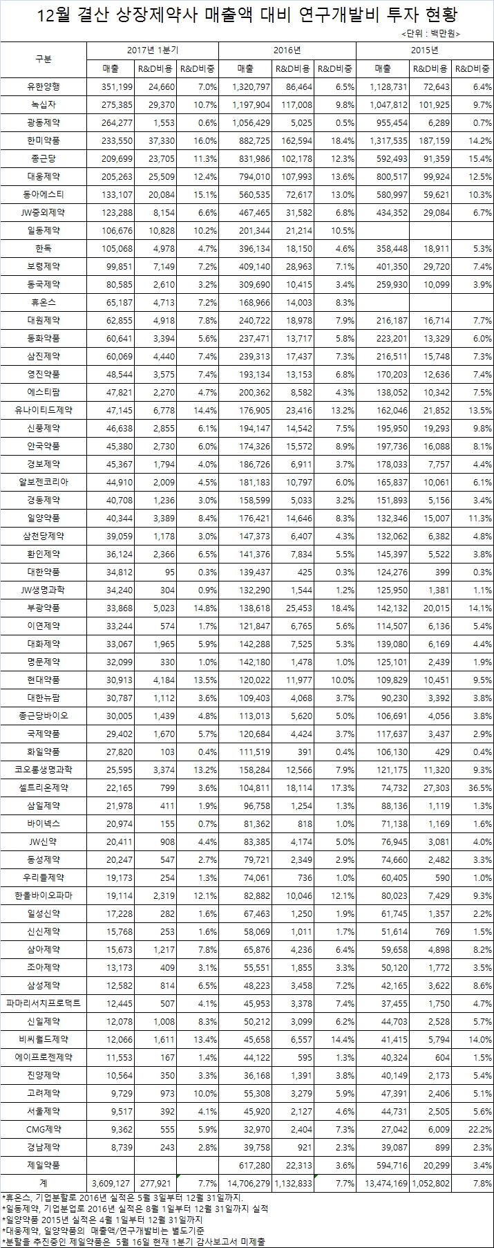 약업닷컴(www.yakup.com)이 12월 결산 상장제약 60개사의 2017년 1분기 보고서를 분석한 결과, 매출액 대비 연구개발비 비중은 평균 7.7로 나타났다.(지주회사, 바이오제약사 제외)