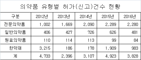 2016년에는 481품목으로 전년대비(626품목) 23.2% 감소했다. 2014년과 2015년 일시적인 증가세를 보이던 일반의약품 허가(신고건수)가 감소세로 돌아선 것이다.