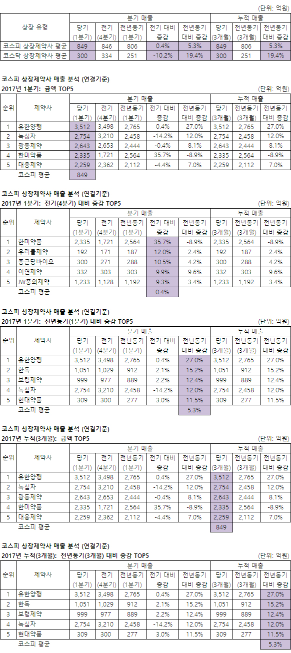 1분기 매출이 가장 많은 제약사는 코스피는 유한양행, 코스닥은 셀트리온(바이오부문), 전년동기대비 증감률이 가장 높은 제약사는 코스피는 유한양행 코스닥은 셀트리온(바이오부문)으로 나타났다.