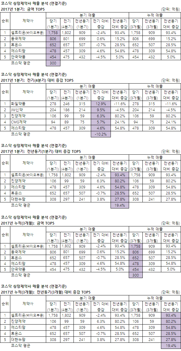 제약사별(전년비)=셀트리온은 849억 증가(램시마 등 바이오시밀러수출 853억 증가-추정), 진양제약은 47억 증가(제품 43억 증가), 에스티팜은 169억 증가(원료 제품 170억 증가), 휴온스는 144억 증가( '중단영업' 2016 1분기 매출 507억,보툴리눔톡신 CMO 등 견인), 대한뉴팜은 67억 증가(제품 44억 증가, 상품 23억 증가)했다.