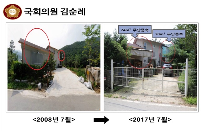 김순례 의원은 "박 후보자의 부인은 이 뿐만 아니라 건물의 무단증축에 대한 의혹이 있다"면서 "실제 2008년 7월 당시에는 2층 테라스에 철골만 있었지만 2017년 7월에는 유리와 벽으로 둘러쌓인 온전한 공간으로 확대되어 있었다. 애초 건축을 할 때부터 건축사용승인 후 증축에 대한 허가를 받지 않기 위한 꼼수를 부린 것"이라고 주장했다.