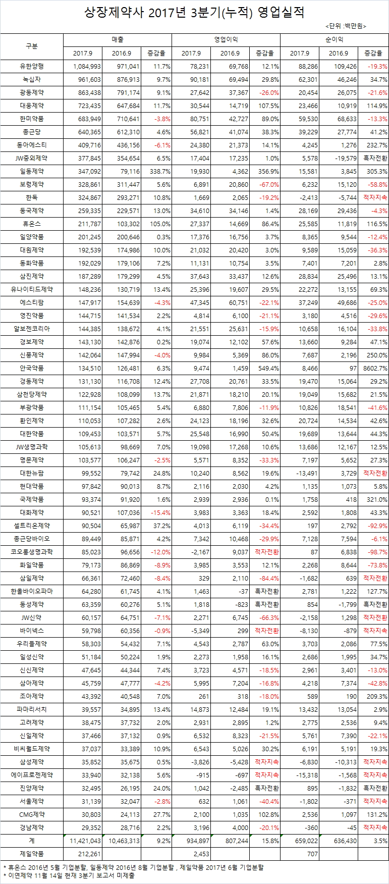 약업닷컴(www.yakup.com)이 코스피 및 코스닥 상장제약사들의 2017년 3분기(누적) 실적을 집계한 결과, 매출은 전년 동기 대비 9.2% 성장하고, 영업이익은 15.8% 증가한 것으로 나타났다. <지주회사 및 바이오기업 제외>