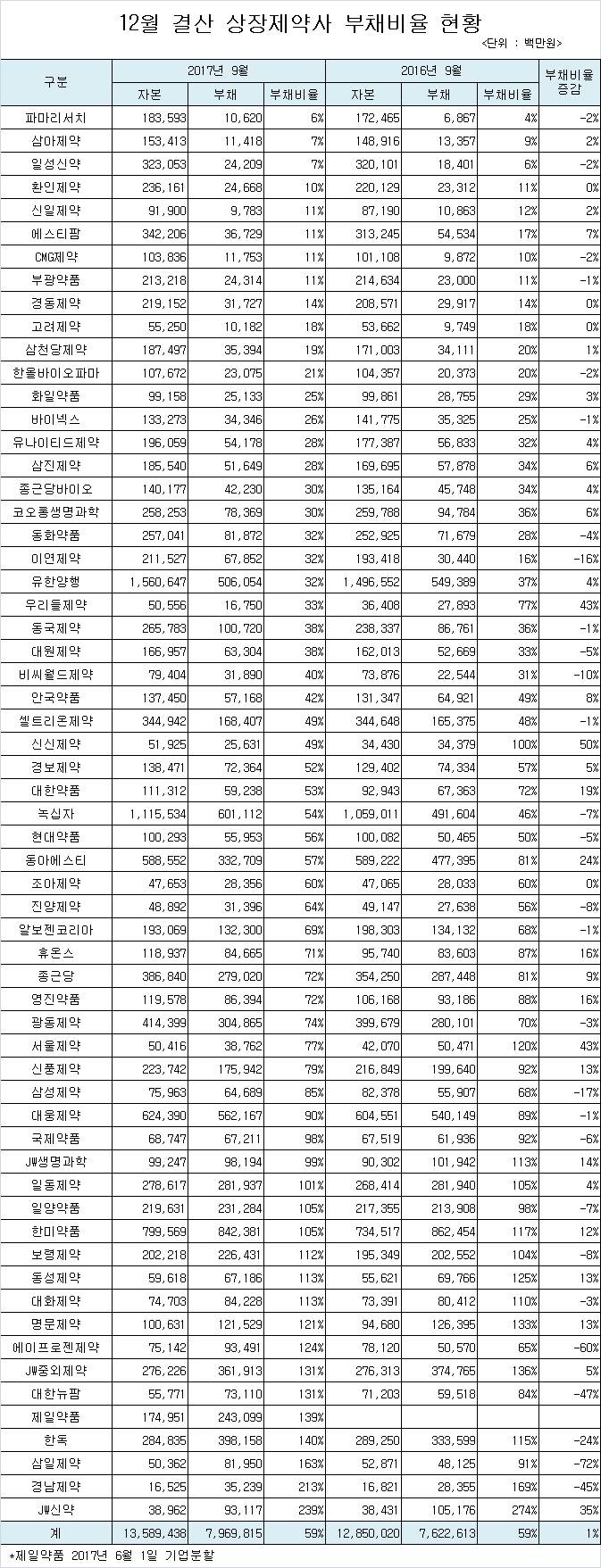 약업닷컴(www.yakup.com)이 12월 결산 코스피 및 코스닥 상장제약사 61개사의 2017년 3분기 보고서를 분석한 결과, 이들 업체들의 평균 부채비율은 59%로 집계됐다.(지주회사 및 바이오기업 제외)