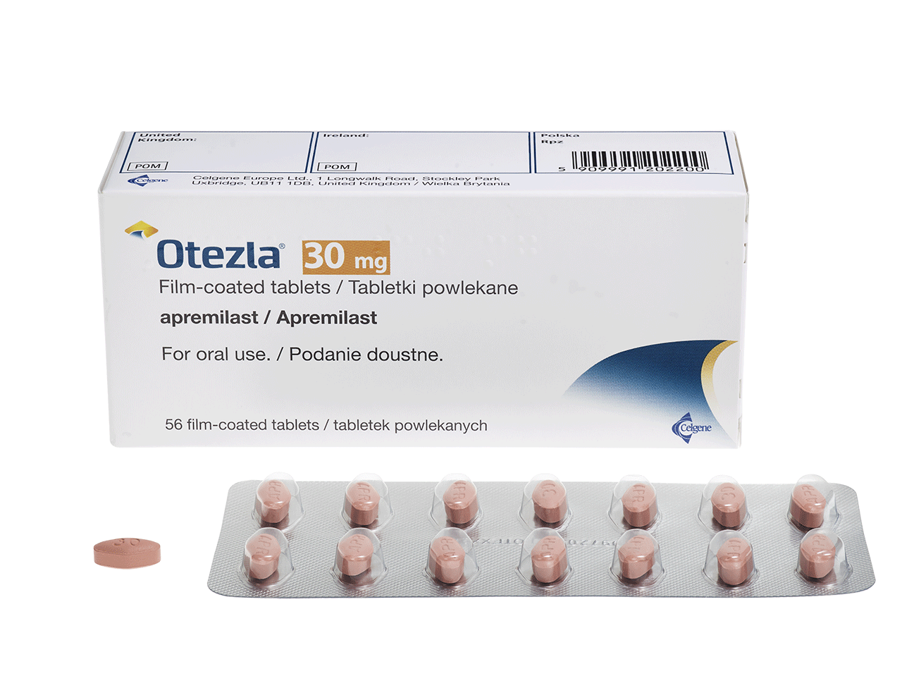 오테즐라®는 경구용 PDE4 억제제로서 세포 내 고리형 AMP(cAMP)의 농도에 특이적으로 작용하는 새로운 계열의 건선 및 건선성 관절염 치료제다. PDE4 억제제는 cAMP의 세포 내 수치를 상승시켜 염증매개체를 간접적으로 조율하는 혁신적인 경구용 치료제다.