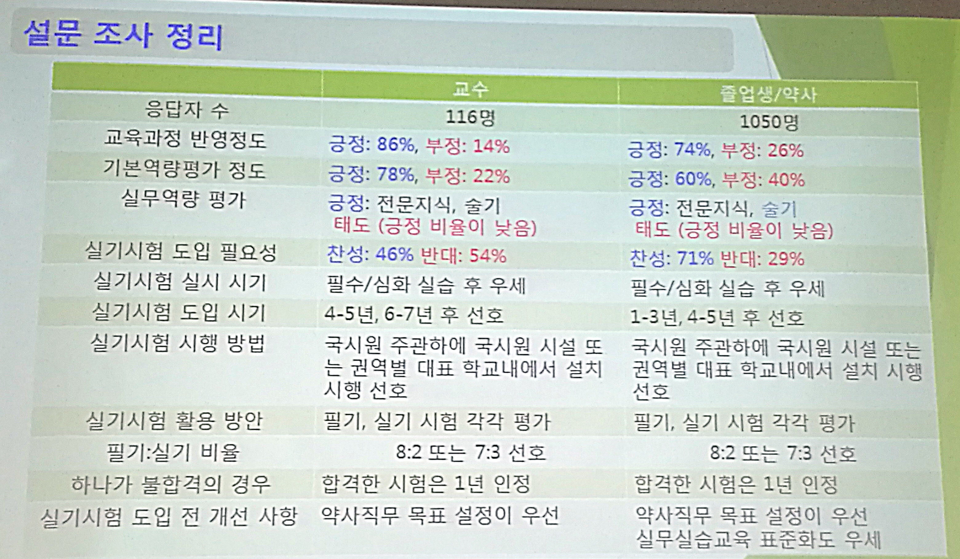 설문결과를 살펴보면, 우선 두 그룹 모두 현행 약사국가시험의 약대 교육과정 반영에 대해 긍정적(교수군 86%, 약사군 75%)으로 평가했으며, 실무역량 평가에서 전문지식·술기를 긍정적으로 평가하고, 태도를 부정적으로 평가한 점도 같은 의견이었다.