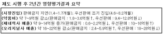 평가 결과, 제네릭사의 연구개발비는 판매금지로 인해 약 400~1,600만원 감소, 우선판매품목허가로 인해 약 6,800~1억1,600만원 증가한 것으로 나타났다.