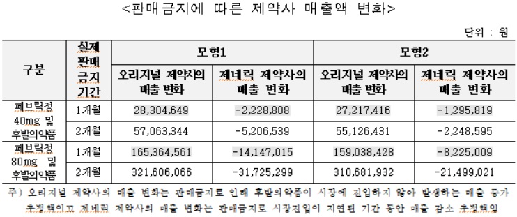 페브릭정 후발의약품의 판매금지에 따른 시장 진입 지연으로 판매금지가 없었을 경우에 비해 오리지널 제약사의 매출은 실제판매금지기간에 따라 약 1억9,300∼3억7,900원(모형 1기준), 약 1억8,600~3억6,600만원 증가(모형 2기준)가 추정됐다.