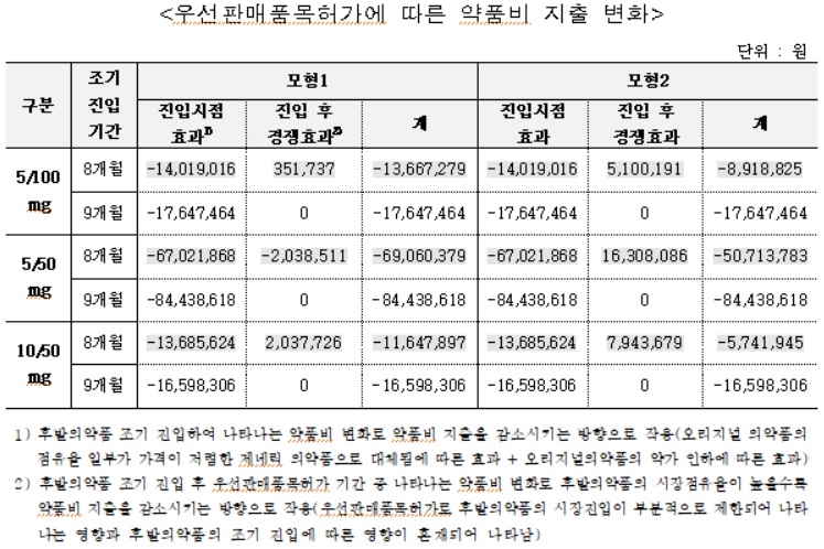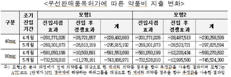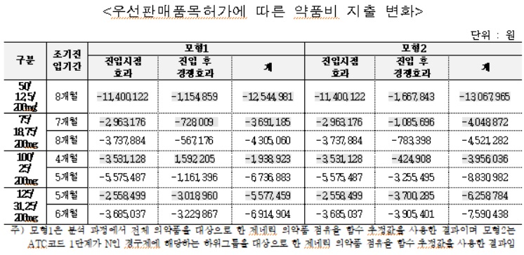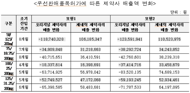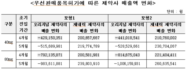 제네릭 제약사의 매출은 실제판매금지기간에 따라 약 1,600∼3,700만원(모형 1기준), 약 900~2,300만원(모형 2기준) 감소가 추정됐다.