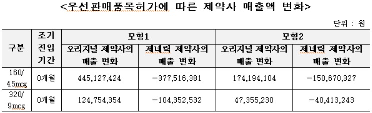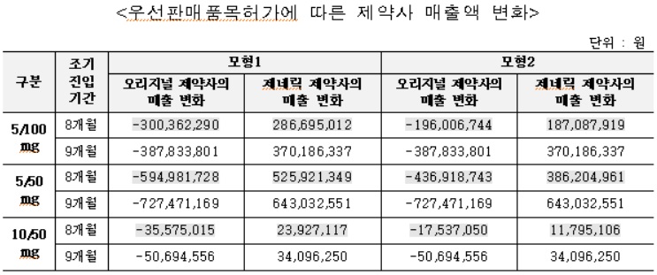 제네릭사 매출은 약 9~14억원 증가(판매금지 0.6~2.2억↓, 우선판매 10~16억↑)했으며, 오리지널사 매출은 약 16~22억원 감소(판매금지 2.4~5.9억↑, 우선판매 18~28억↓)했다.
