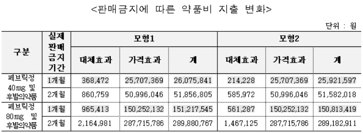 페브릭정 후발의약품의 약품비 지출은 판매금지에 따른 시장 진입 지연으로 실제 판매금지기간에 따라 약 1억7,700∼3억4,200만원(모형 1기준), 약 1억7,700∼3억4,100만원(모형 2기준) 증가한 것으로 추정됐다.
