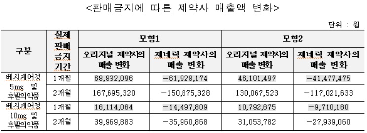 제네릭 제약사의 매출은 실제판매금지기간에 따라 약 7,600∼1억8,700만원(모형 1기준), 약 5,100~1억4,500만원(모형 2기준) 감소가 추정됐다.