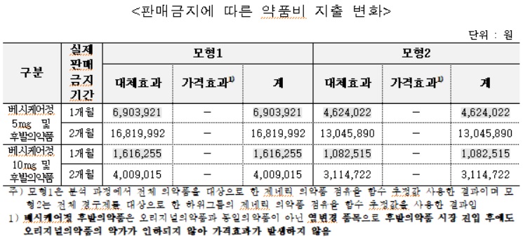 베시케어정 후발의약품의 경우 판매금지에 따른 시장 진입 지연으로 판매금지가 없었을 경우에 비해, 오리지널 제약사의 매출은 실제판매금지기간에 따라 약 8,500∼2억800만원(모형 1기준), 약 5,700~1억6,100만원(모형 2기준) 증가가 추정됐다.