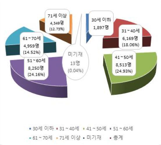 연령층별로는 연령대가 낮아질수록 여약사의 비율이 점점 높아지는 것으로 나타났으며, 특히 30대 이하에서는 여약사의 비중이 높게 나타났다. 이러한 현상은 60세까지 뚜렷이 나타나고 있으며, 71세 부터는 연령층이 높아질수록 남약사의 수가 여약사보다 높아지는 것을 알 수 있다.