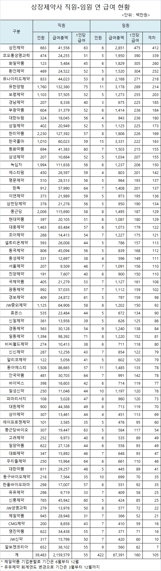 임원들은 급여이외에는 별도의 보수를 지급받고 있지 않지만, 직원들의 급여에는 복리후생비 성과급 등이 제외돼 있어 실제 격차는 1억원을 밑돈다는 것이 제약업계 관계자들의 설명이다.