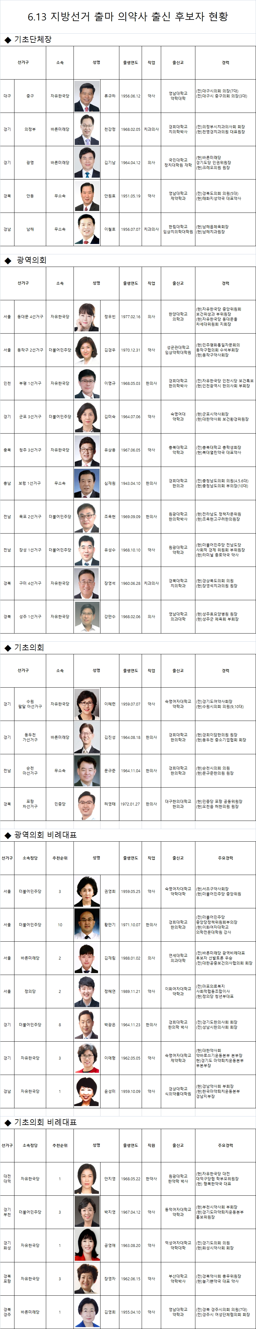 ◆광역의회 비례대표 - 총 7명의 의약사가 소속 정당의 추천을 받고 비례대표로 광역의회에 도전한다. 직업별로는 약사 4명, 한의사 2명, 의사 1명이다.