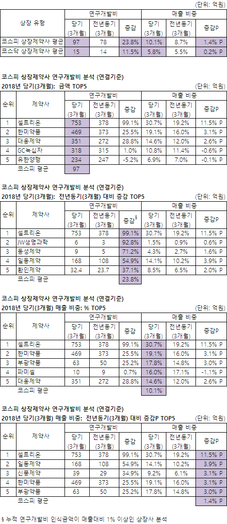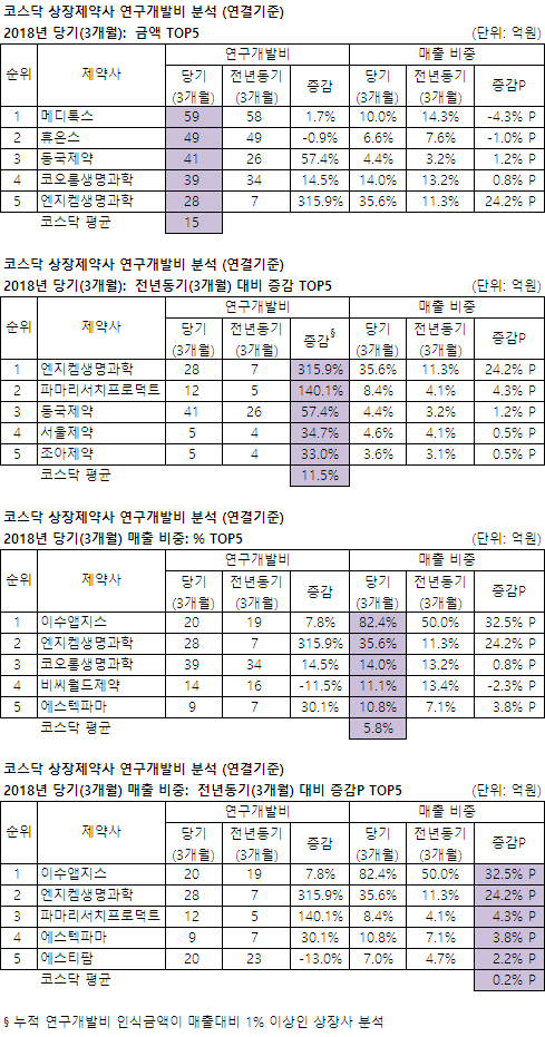 연구개발비가 가장 많은 제약사는 코스피는 셀트리온 코스닥은 메디톡스, 전년동기대비 증감률이 가장 높은 제약사는 코스피는 셀트리온 코스닥은 엔지켐생명과학, 매출액대비 비중이 가장 높은 제약사는 코스피는 셀트리온 코스닥은 이수앱지스로 각각 나타났다.