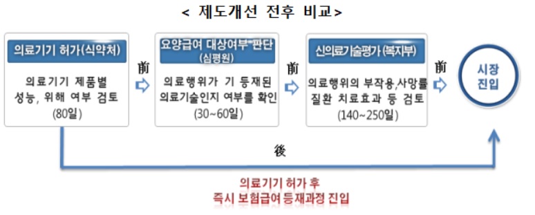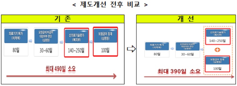 인허가 과정의 실질적 원스톱 서비스 체계 구축: 규제기간을 단축하기 위해 신의료기술평가의 절차를 간소화(평가기간 280→250일, 30일 단축)하고, 보험등재심사와 신의료기술평가를 동시에 진행(490일→390일 100일 단축)하는 방안을 마련할 계획이다.