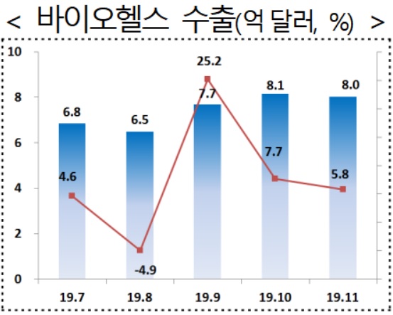 11월 바이오헬스 분야의 수출액은 8억 300만 달러로, 전년대비 5.8%의 증가율이었다.