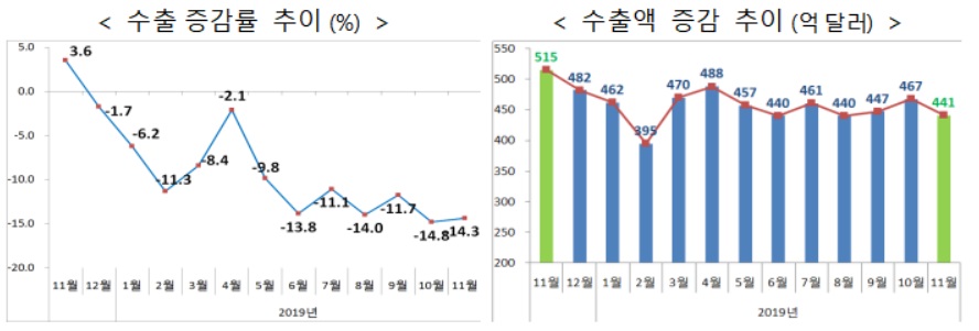 산업통상자원부가 1일 발표한 '2019년 11월 수출입동향'에 따르면, 국내 산업계 총 수출액은 전체 수출이 전년 같은 기간보다 14.3% 감소한 441억달러, 수입은 13.0% 감소한 407억 3천만 달러를 기록했다. 무역수지는 33억 7천만 달러였다.(94개월 연속 흑자)