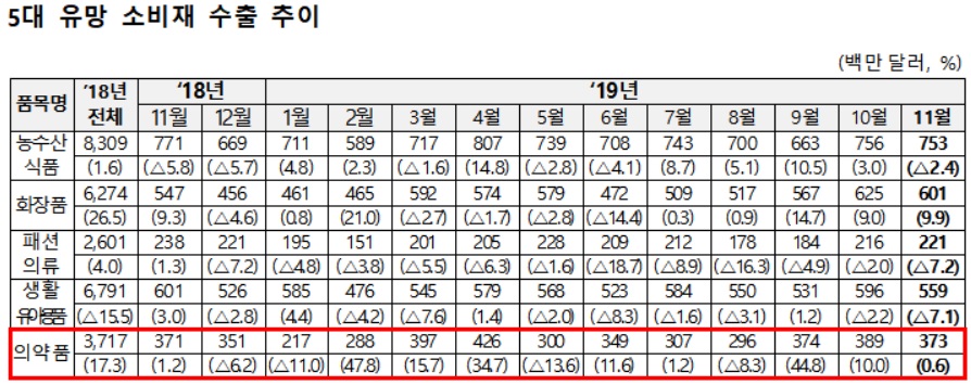 11월 의약품 분야 수출액은 3억 7,300만 달러로, 전년 대비 0.6% 증가한 것으로 나타났다.