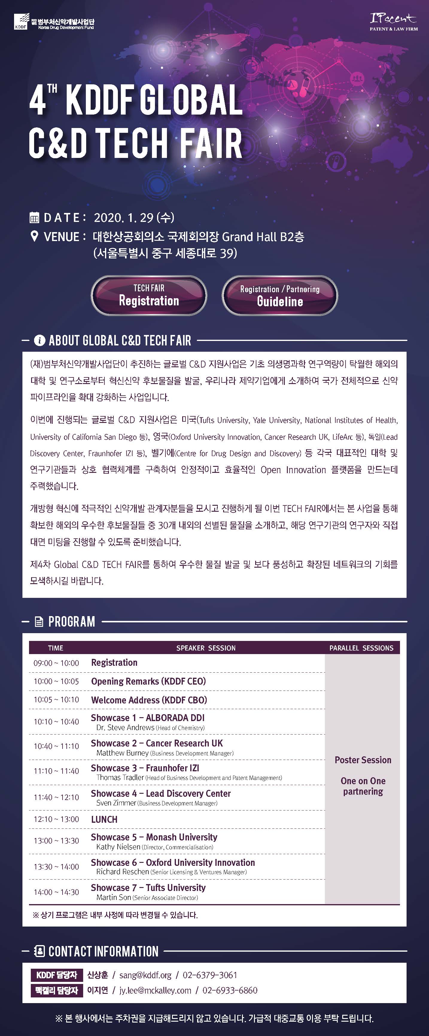 (재)범부처신약개발사업단(단장 묵현상, 이하 사업단)은 오픈이노베이션 사업의 일환으로 4년째 진행하고 있는 글로벌 C&D(Connect and Development) 테크페어를 오는 29일(수) 대한상공회의소에서 개최한다고 밝혔다.