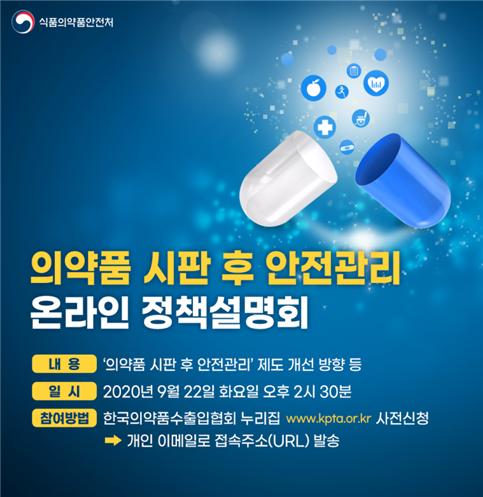식품의약품안전처는 9월 22일 의약품 제조·수입업체 안전관리 업무담당자 등을 대상으로 ‘의약품 시판 후 안전관리 온라인 정책 설명회’를 개최한다.