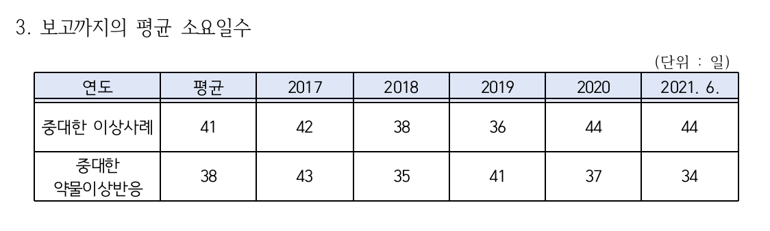 하지만 2017년부터 2021년 6월까지 중대한 약물 이상반응 총 4만 3,957건 중 1만 4593건(33.2%)이 보고 기간 경과 후 보고되었다. 전체 보고의 보고까지의 평균 소요일수는 15일의 두 배가 넘는 38일이었다. 이상사례와 중대한 이상사례의 평균 소요일수는 각각 80일과 41일이었다.