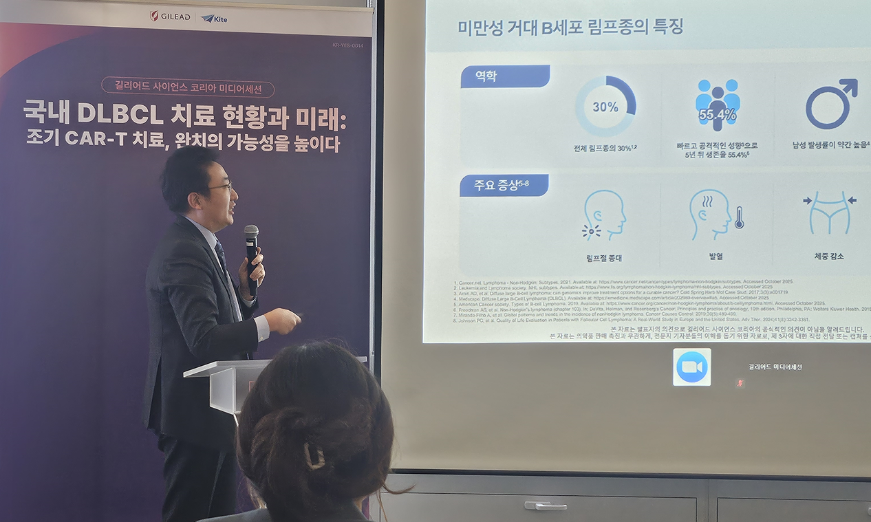 국내 미만성거대B세포림프종(DLBCL) 치료 환경이 빠르게 변화하는 가운데, 길리어드 사이언스 코리아는 20일 ‘국내 DLBCL 치료 현황과 미래: 조기 CAR-T 치료, 완치를 앞당기다’를 주제로 미디어 세션을 열고 국내 환자군 특성, 조기 CAR-T 치료의 필요성, 예스카타(Yescarta)의 임상 근거를 중심으로 최신 치료 전략을 제시했다.