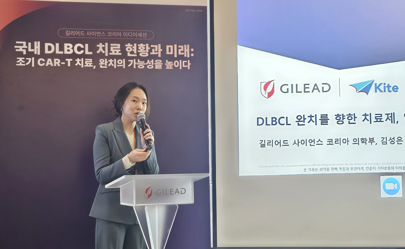 세션은 ▲가톨릭대 서울성모병원 혈액내과 민기준 교수의 ‘DLBCL 치료의 혁신적 전환점: CAR-T 조기 치료와 예스카타의 역할’ ▲길리어드 사이언스 코리아 의학부 김성은 이사의 ‘DLBCL 완치를 향한 예스카타의 노력’ 등 2개의 세션으로 진행됐다.