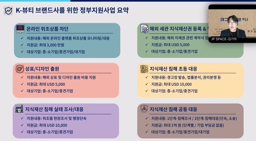 이어 김 대표는 위조품 대응이 필요한 기업들이 활용할 수 있는 정부 지원 사업 6가지를 소개하며, 예산·역량이 부족한 중소 브랜드도 실질적인 조치를 취할 수 있다고 강조했다.