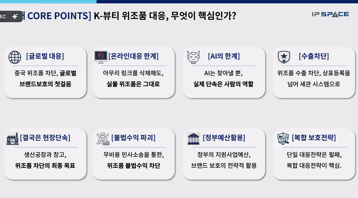 마지막으로 문 대표는 K-뷰티 기업들에게 "지금은 K-뷰티 위조품의 세계 유통을 막기 위한 4중 성벽을 쌓아야 할 때"라며 "지원사업을 활용하고 외부 전문 기관과 협력한다면, 위조품 피해를 줄이고 브랜드 신뢰도도 지킬 수 있을 것"이라고 강조했다.
