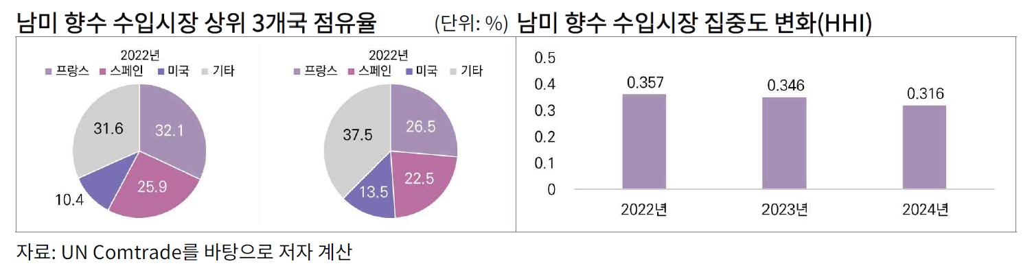 보고서에 따르면 남미에서 향수 수입이 집중된 상위 3개국(프랑스, 스페인, 미국)의 합산 점유율은 2022년 68.4%에서 지난해 62.5%로 하락했고, 전체 수입 대상국 수는 같은 기간 63개에서 66개로 늘었다. 기존 주요국 중심 수입 구조가 완화되고 있는 흐름이다.