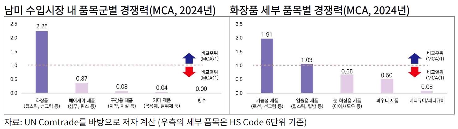 무역협회가 지난해 UN 무역 자료를 분석한 결과, 남미 시장에서 한국 화장품은 MCA 지수가 2.25로 집계됐다. MCA 지수는 시장비교우위를 나타내는 지수로 1보다 클 경우 비교우위, 1보다 작을 경우 비교열위로 해석된다. 화장품은 한국의 남미 수출 품목 중 유일하게 비교우위를 갖는 분야로 평가됐다. 로션, 선크림, 재생크림 등 기능성 제품이 1.91로 가장 높은 비교우위를 가진 것으로 나타났다. 립스틱, 립밤 등의 입술용 제품도 1.03으로 비교우위 품목에 속했다.