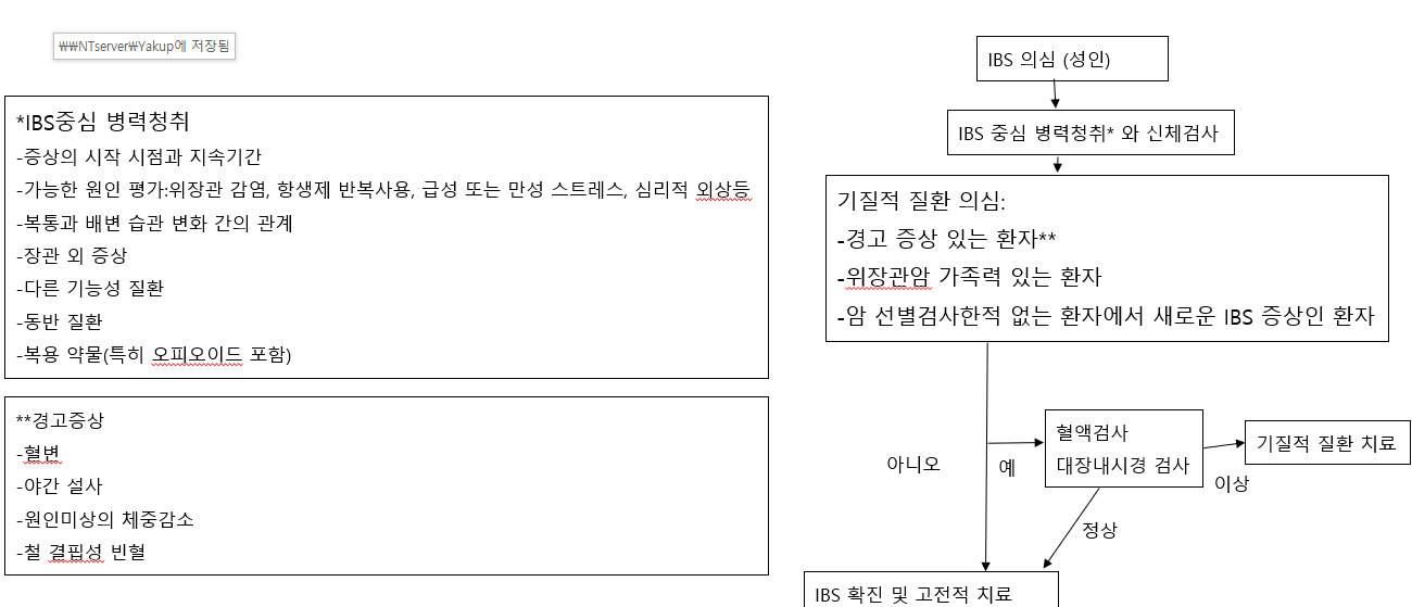 - 경고 증상(또는 적색깃발)이 있는 과민성장증후군 증상을 나타내는 환자들은 즉시 검사를 받는 것이 합당하며, 경고 증상에는 위장관 출혈 병력, 이상 체중감소, 원인미상의 구토, 진행성 연하곤란, 염증성장질환, 셀리악병, 빈혈의 증거, 악성질환의 가족력과 고령에서 새롭게 발생한 증상들이 있다