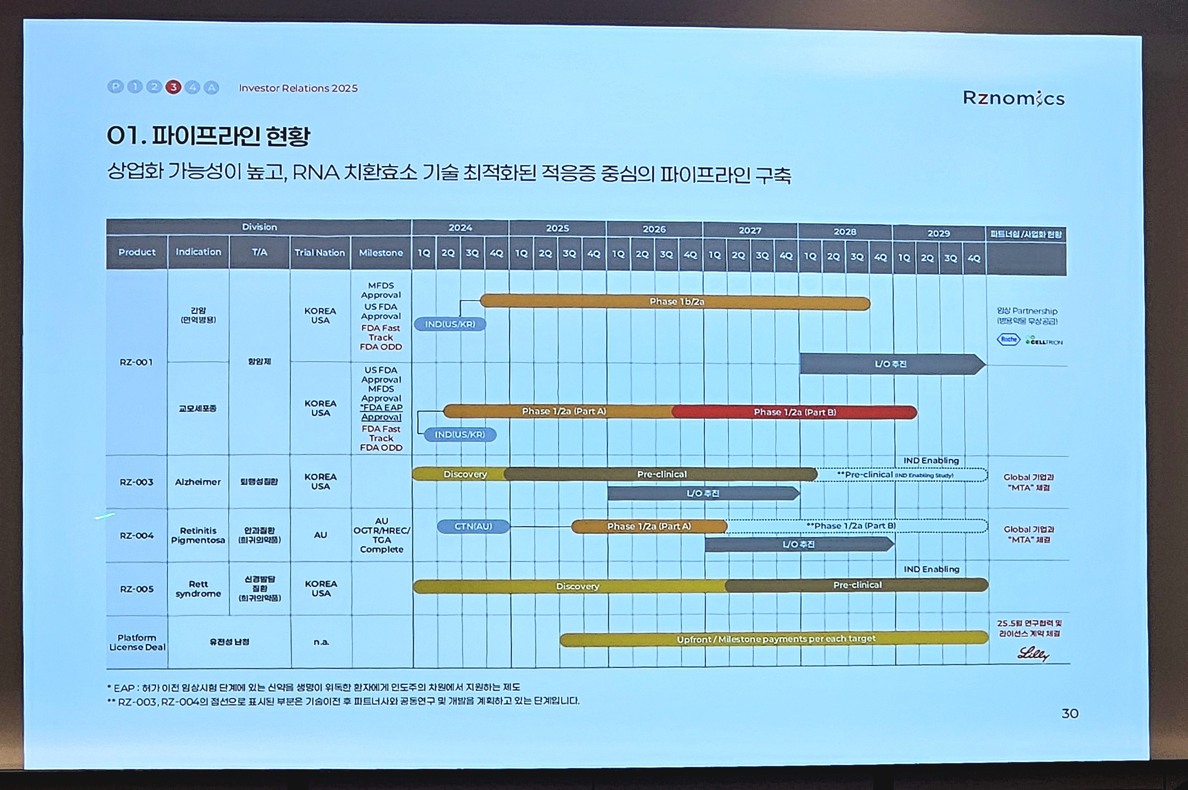 상장으로 확보한 자금은 RNA 교정 플랫폼 고도화와 핵심 파이프라인의 글로벌 임상 및 상업화 가속에 투입된다. 대표 파이프라인 ‘RZ-001’은 간암과 교모세포종을 적응증으로 미국 FDA로부터 희귀의약품(ODD)과 패스트트랙 지정을 받았다. 교모세포종은 동정적 치료목적(EAP) 하에 환자 투여가 진행 중이다.