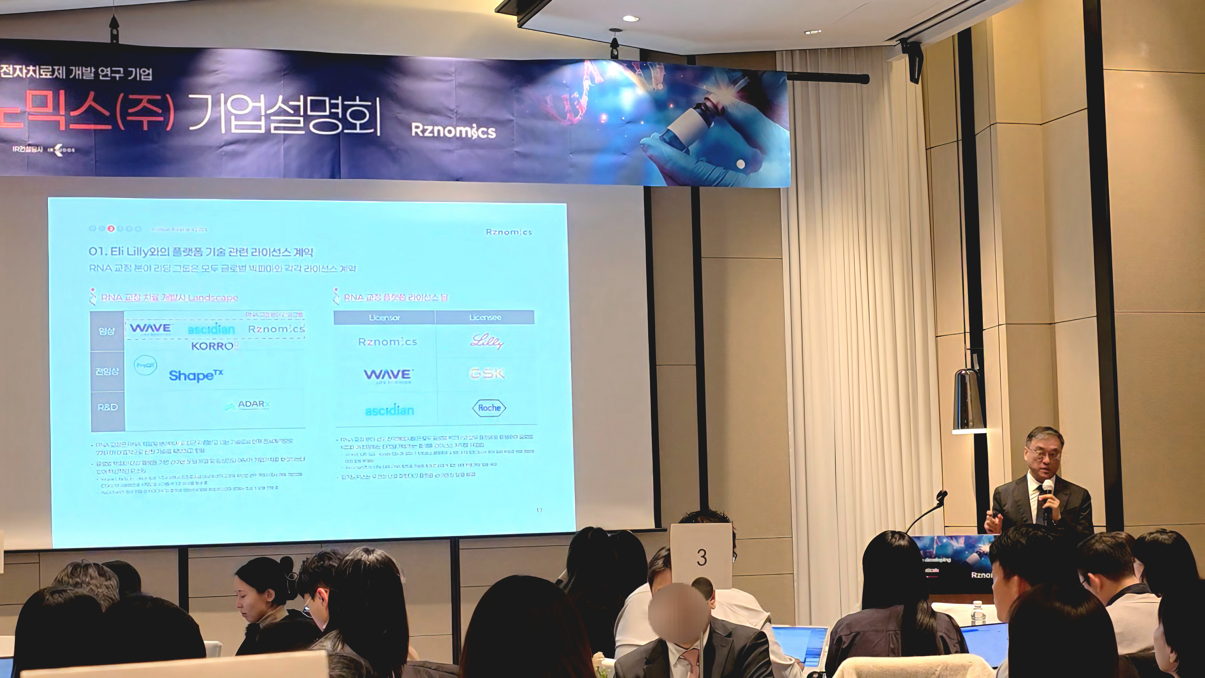 “알지노믹스 플랫폼은 사실상 모든 RNA 표적에 적용할 수 있고, 알려진 돌연변이의 상류 부위를 겨냥해 단일 물질로 다양한 변이를 교정할 수 있는 구조를 갖고 있습니다. 이 기술력을 글로벌에서 인정받은 것이 일라이 릴리(Eli Lilly)와의 1조9000억원 규모 계약입니다.”