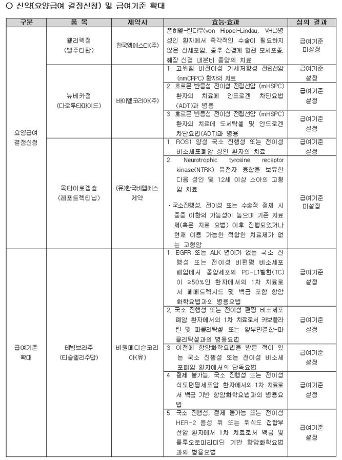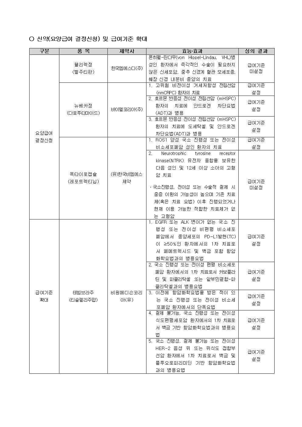 신청 효능은 폰히펠-린다우(VHL)병 성인 환자에서 신세포암, 중추신경계 혈관 모세포종, 췌장 신경내분비종양 치료였으나 급여 판단 기준을 충족하지 못했다.
