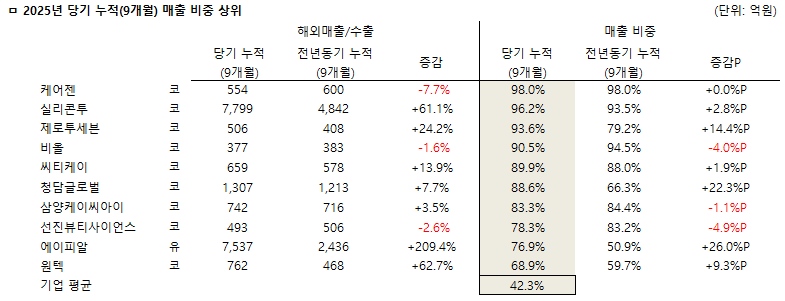 △ 2025년 3분기 누적 해외매출·수출 비중 상위 10개사