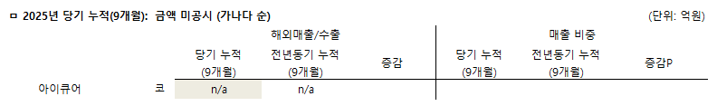 아이큐어는 전년동기 에 이어 이번에도 해외 매출 및 수출실적을 공시하지 않았다.