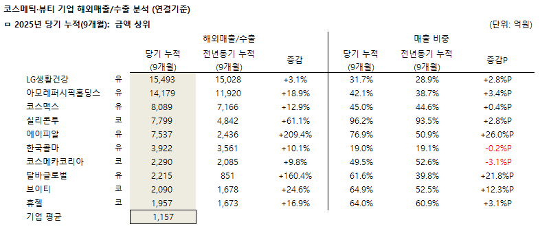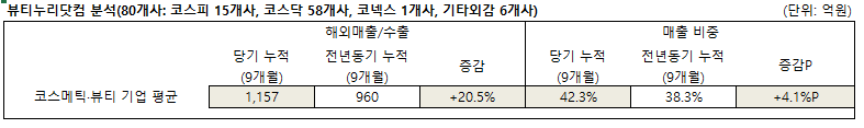 약업신문 자매지 화장품신문이 금융감독원 공시 2025년 11월 분기보고서(연결기준) 분석 결과, 화장품 관련 기업 80개사(코스피 15, 코스닥 58, 코넥스 1, 기타 외감 6)의 올해 3분기 누적 기준 해외 매출 및 수출 실적 평균은 1157억원으로 나타났다. 전년동기 960억원 대비 20.5% 증가했다. 전체 매출에서 차지하는 비중은 평균 42.3%로 전년동기 38.3% 대비 4.1%p 확대됐다.