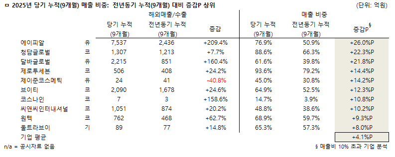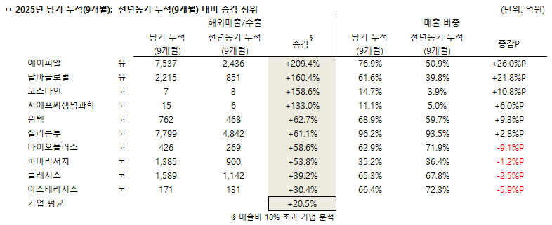 △ 2025년 3분기 누적 해외 매출·수출 비중 전년비 증가율 상위 10개사