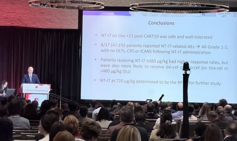 이번 ASH에서 구두 발표된 CD19 CAR-T 치료 후 NT-I7을 병용한 임상 1상(NIT-112)은 미국 워싱턴대학교 의과대학(Washington University School of Medicine in St. Louis)의 종양내과 전문의이자 혈액암 전문가인 자커리 크리스(Zachary Crees) 박사가 직접 소개했다.