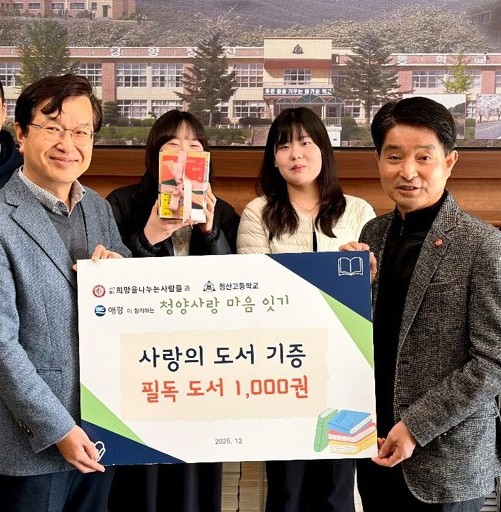 애경산업은 청양군, (사)희망을나누는사람들과 함께 18일 충남 청양군 정산고등학교서 지역 청소년의 올바른 독서 문화 조성을 위한 ‘사랑의 도서 기증 전달식’을 진행했다.