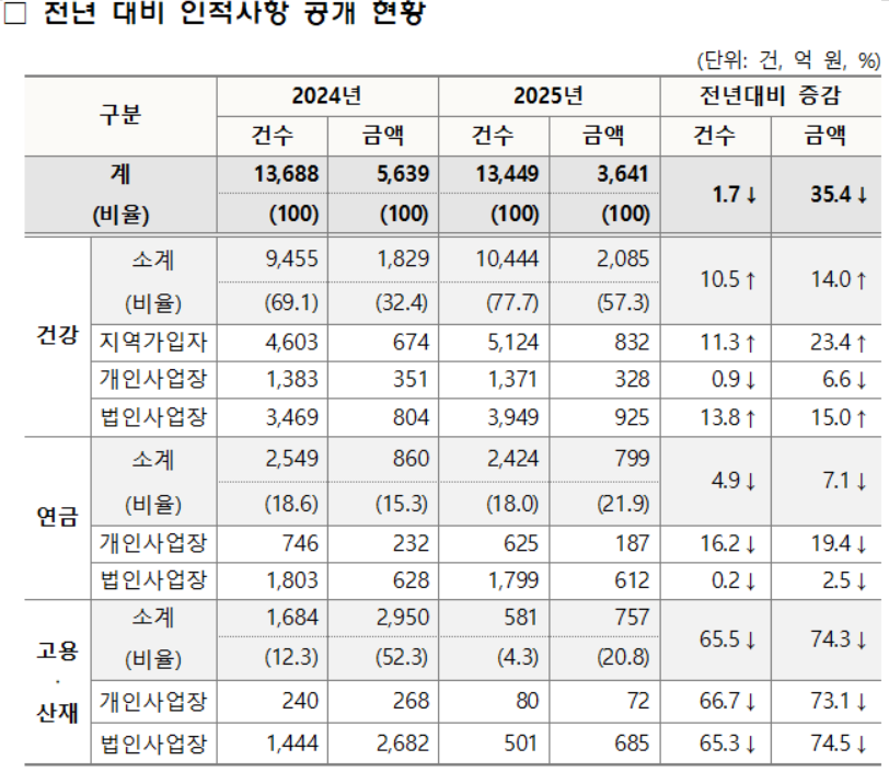 이번에 공개된 체납액 규모는 총 3641억 원으로, 전년(5639억 원) 대비 35.4% 감소했다. 공개 인원 역시 지난해 1만3688명에서 1.7% 줄었다. 공단은 지난해 고용·산재보험 인적사항 공개 기준이 강화되며 고액 체납자가 일시적으로 대거 공개된 이후, 올해는 신규 체납자가 감소한 영향이라고 설명했다.