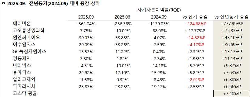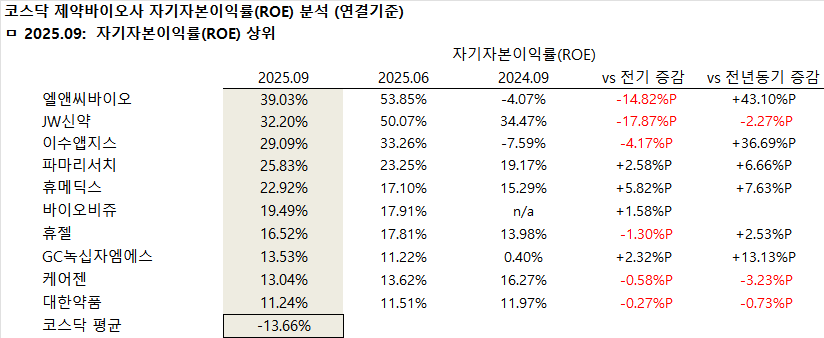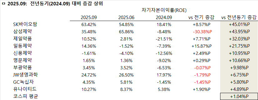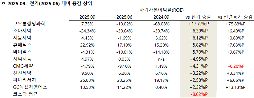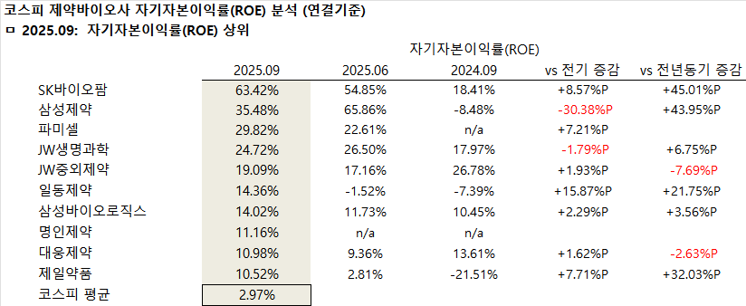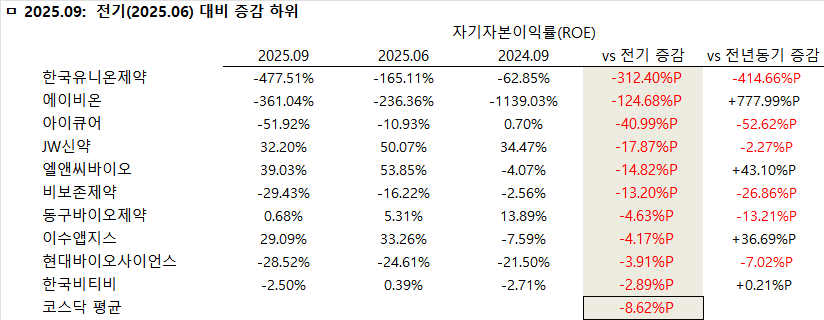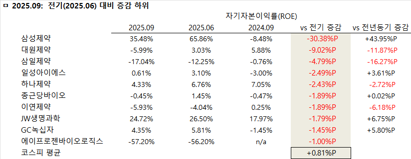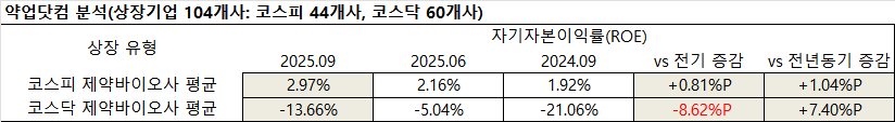 | 1 | 상장 제약바이오 상반기 자기자본이익률 평균 코스피 2.97%, 코스닥 -13.66% |