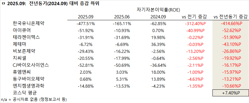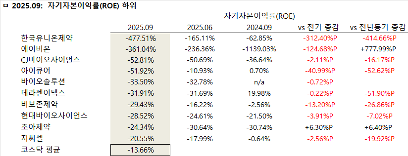 자기자본이익률 하위는 한국유니온제약(-477.51%), 에이비온(-361.04%)이 코스닥 평균(-13.66%)를 크게 웃돌았다. 이어 CJ바이오사이언스(-52.81%), 아이큐어(-51.92%)가 -50%를, 바이오솔루션(-33.50%)이 -30%를 넘으며 '톱5'에 들었다. 지씨셀은 -20.55%로 10위에 들었다.